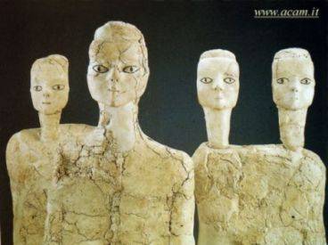 Nel 1997, leggendo la rivista "Archeo", fui attratto dalla fotografia che vedete qui a sinistra. Perché? Innanzi tutto vorrei descrivervi la storia di questi reperti fotografati."Nel 1997, presso la Arthur M. Sackler Gallery di Washington, fu allestita la mostra "Archeologia sulle rive del Giordano", curata da Ann Gunter e incentrata su un gruppo di cinque sculture rinvenute nel 1986 nel sito preistorico di Ain Ghazal, nei pressi di Amman (7000-6500 a.C. circa), capitale della Giordania. L'anno successivo al ritrovamento, il Conservation Analytical Laboratory della Smithsonnian Institution intraprese l'opera di studio e conservazione di queste interessanti sculture, prestate all'istituzione americana dal Dipartimento di Antichità della Giordania.
