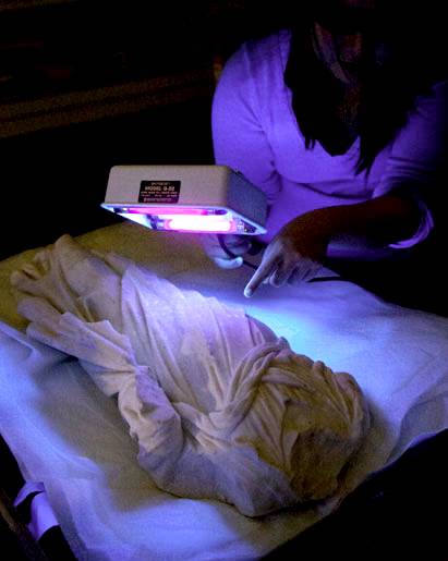 Ivy Nguyen mostr come ha lavorato con una luce nera per identificare le aree della scultura che conservavano tracce di colorazione. Credit L.A. Cicero