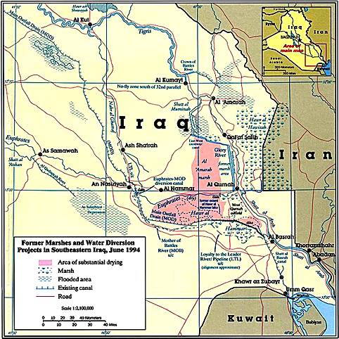 Pochi possono immaginare che queste fossero zone umide e che solo alcune parti fossero coltivate. Ma prima del 1950, questa parte della regione del delta era ricca di terreno paludoso. Tra il 1950 e gli anni ' 90, la regione fu prosciugata sistematicamente da parte del governo iracheno per, apparentemente, procedere verso uno sviluppo agricolo. La politica ha svolto un ruolo decisivo. Saddam Hussein ha prosciugato le aree come parte del suo piano per controllare i dissidenti sciiti che vi abitano. La maggior parte degli arabi delle paludi, che tradizionalmente abitavano la zona, sono stati trasferiti, lasciandola sostanzialmente spopolata dei suoi ex residenti di lunga data. Ora, il ritorno della regione alle condizioni paludose è stato dichiarato una priorità nazionale.