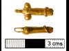 "è cavo, fatto di una lamina metallica saldata per il lungo, arrotondata con un foro a entrambe le estremità. Sulla cima è saldato un anellino a tre giri, con testicoli applicati a entrambi i lati, fatti di globi solidi. Altre applicazioni di filigrana nella parte inferiore (forse come appigli per la saldatura) indicano la prosecuzione verso il resto del corpo".