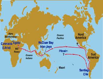 Per iniziativa egiziana, nell'anno 232 a.C., un gruppo di marinai sarebbe dunque salpato con una flotta da un porto della Cirenaica e â€" dopo avere risalito un tratto del Nilo â€" avrebbe imboccato il Mar Rosso attraverso il famoso canale scavato dai Faraoni.