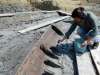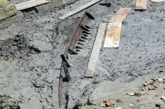 Fasciame della fiancata della nave portato alla luce dagli archeologi (Faraglia) PROTETTA DALL'ARGILLA - Il ritrovamento, effettuato un mese fa, è stato tenuto gelosamente segreto fino a giovedì 28. Ma gli archeologi avevano subito intuito l'importanza dello scavo e stavano lavorando per preservare il legno dal deterioramento conseguente all'esposizone agli agenti atmosferici. Fino ad oggi, infatti, la nave si era perfettamente conservata grazie alle condizioni ideali del terreno: lo scafo è infatti intrappolato in uno spesso strato di argilla che ha impedito al legno di marcire e ha di fatto "sigillato" la nave. La poca acqua che filtra attraverso l'argilla, sottolineano gli specialisti, non ha danneggiato nulla: "Anzi, è servita a mantenere elastico il materiale ligneo", spiega Alessandra Ghelli, l'archeologa che ha scoperto il reperto durante i sondaggi preventivi ai lavori del cantiere per il nuovo ponte.
