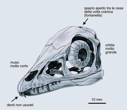 POCHI GIORNI - Appena sgusciato fuori da un uovo, con la fontanella aperta sul capo come nei cuccioli di uomo e con il ventre ancora gonfio di una piccola riserva di tuorlo, ebbe giusto il tempo di guardarsi intorno stupito, sgranchirsi le gambe al tepore del sole, assaporare i primi pasti. Anche questi conosciamo bene, ora, addirittura nell'ordine in cui furono ingeriti: nel suo intestino, lo stesso incredibile destino cristallizzò le scaglie di una sardina, i cui anelli di accrescimento dicono che aveva nuotato per nove stagioni, prima di finire tra i dentini seghettati di Ciro; poi un piccolo rettile e un altro pesce, e infine la zampa di una grande lucertola, così grande per lui, che furono i genitori a procacciarla. Il dinosauro neonato non ebbe neppure il tempo di digerirla, che vento e acqua lo spazzarono via improvvisamente, sottraendolo alla vita e immobilizzandolo per 110 milioni di anni nel fondo fangoso del mare che piano piano diventava roccia. Tanto è dovuto passare, finché altri esseri potessero scoprire chi fosse questa creatura e come avesse trascorso la sua brevissima esistenza.