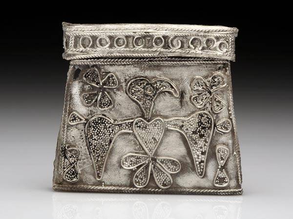 Un uccello regale, forse un'aquila, dispiega le ali su questa kaptorga (un contenitore di amuleti) in argento scoperta nel cimitero.L'emblema, che non somiglia a nulla di già visto, potrebbe essere un motivo di famiglia o una mera decorazione, ma il suo significato è sconosciuto. Una kaptorga simile è stata rinvenuta in una seconda sepoltura.
