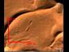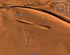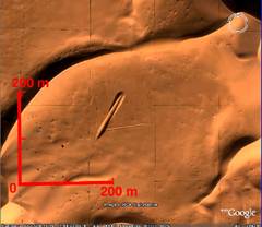 La misteriosa forma affusolata appariva inserita quasi in diagonale all'interno d'altre tracce (formate da due linee parallele) che formavano un ampio rettangolo (dimensioni di circa 120 x 200 m) e s'interrompevano verso Nord, presso la cresta d'una duna. Dall'alto a destra di questa specie di "recinto" provenivano altre due tracce parallele che scavalcavano la cresta della duna, ee erano con evidenza le tracce delle ruote d'un veicolo fuoristrada. Anche quello che sembrava un "recinto rettangolare" poteva forse essere stato prodotto dalle tracce di veicoli fuoristrada... La foto satellitare risaliva al 20 gennaio 2005.