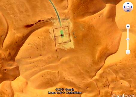 Aggiornamenti - Oggi, nel sito esatto delle osservazioni, Google Earth mostra la presenza d'un pozzo petrolifero (la foto, datata dallo stesso sito di Google, è del 13 aprile 2011).Il suo recinto è proprio quel "rettangolo" che si vedeva nelle foto precedenti. Tutt'intorno, a breve distanza, sorgono molteplici altri pozzi. L'area sembra intensamente vissuta dalla società algerina che opera alle estrazioni d'idrocarburi, e dai suoi partners internazionali. Ciò fa naturalmente supporre che la gran traccia "affusolata" che si vedeva scavata nella sabbia non fosse altro che il tunnel d'avvio alla perforazione, scavato nelle sabbie. Al centro, dove sarebbe stato eretto il traliccio del pozzo, esso appariva simile al "mucchietto di terra" sull'imbocco del tunnel d'una talpa.