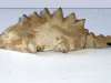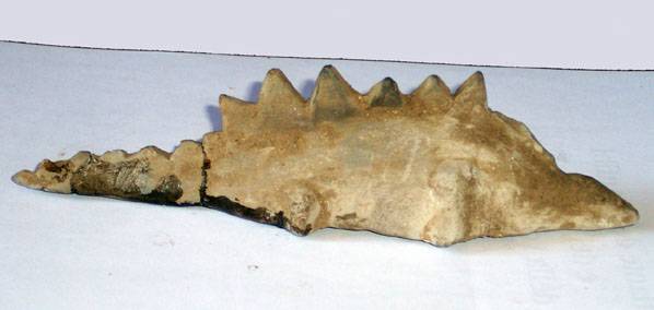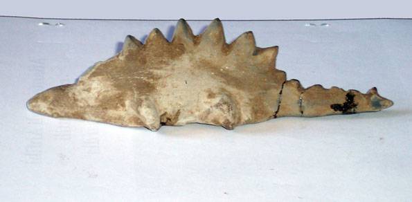 Ma veniamo al pezzo forte della collezione dell'avvocato Tolone, quello su cui si puntano tutti gli interrogativi degli studiosi, e per cui il collezionista è stato addirittura tacciato di falso, si tratta di una statua di terracotta di circa 18 cm di lunghezza raffigurante uno strano sauro con delle placche sulla schiena, le placche sono triangolari, e scorrono lungo il dorso sino alla coda, la vista dall' alto dell'oggetto rivela una strana piegatura delle placche, come se l'animale fosse stato raffigurato in movimento sul terreno...Le zampe sono grosse e goffe, come di un animale di grande stazza, e non simili a quelle di una lucertola o di altro sauro moderno, come il tritone crestato o altri tipi di salamandra cui la scultura è stata accostata. Non esiste alcun tipo di salamandra o sauro tipo iguana tra le specie attualmente conosciute, che abbia delle placche simili, ed allora basta prendere un qualunque manuale di paleontologia e ci si rende conto che l'animale raffigurato nella scultura appartiene alla specie degli stegosauri, una specie di dinosauri con le placche che gli scienziati affermano essersi estinta circa 65 milioni di anni fa... Non è possibile affermano i paleontologi, non può essere affermano gli storici, ma intanto la scultura esiste e l'avvocato Tolone afferma di averla trovata nelle terre di Caria insieme a centinaia di altri reperti di età antica, di una civiltà pre-greca della Calabria, cioè di almeno 3000 anni fa...La statua è stata inoltre ritrovata in due frammenti e poi ricomposta con un po' di adesivo.Inoltre è presente nella collezione un' altra raffigurazione dello strano sauro in bassorilievo su lastra di marmo grezzo, con le stesse identiche caratteristiche fisiche, e nella stessa teca c'è anche un grande osso fossile di un animale sconosciuto, ed una mandibola con grandi denti, anch'essa fossile...Se la statua di terracotta rappresentante il terribile sauro fosse un falso, non dovrebbe essere affatto difficile provarlo sottoponendola a datazione radiocarbonio 14, afferma l'avvocato Tolone, ma se il reperto è autentico ed antico almeno di qualche migliaio di anni, saremmo di fronte ad uno dei più incredibili enigmi dell' archeologia mondiale.
