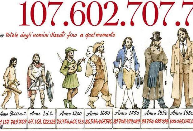 Circa cinquantamila anni fa il nostro globo era popolato da specie differenti del genere Homo, disperse tra Africa e Eurasia, quando piccoli gruppi appartenenti alla nostra specie, Homo sapiens, uscirono dall'Africa e cominciarono a colonizzare vecchi e nuovi mondi. Come si sia imposto il nostro "progresso prepotente", come lo chiama il genetista Luigi Luca Cavalli Sforza, a scapito di tutti gli altri "umani", è ancora un mistero da sciogliere. Fatto sta che da quegli sparuti gruppi di pionieri è discesa una popolazione globale che, come le Nazioni Unite hanno ufficialmente decretato, nell'ottobre del 2011 avrebbe superato i sette miliardi. Tra sismi ed eruzioni, mutamenti di clima, per non dire di epidemie e guerre, non era garantito che le cose andassero davvero così "su questo pianeta instabile e nonostante tutto accogliente", come mostra il filosofo Telmo Pievani nel suo La vita inaspettata (Raffaello Cortina, Milano). Abitualmente siamo impressionati dalla crescita, talvolta prospettandoci un mondo sovrappopolato degno dei peggiori incubi del reverendo Thomas Robert Malthus (1766-1834); un modo differente di vedere le cose ci è ora prospettato dal Population Reference Bureau di Washington i cui ricercatori si interrogano invece non tanto su vivi e nascituri, bensì sui trapassati. Con estrapolazioni audaci (poiché l'avventura di Homo sapiens ci appare assai lacunosa sotto il profilo demografico) si è arrivati alla conclusione, ora pubblicata su Bbc Magazine, che gli attuali sette miliardi sembrerebbero pochi rispetto al totale dei nostri antenati: a partire dai Flintstones stile Hanna&Barbera si tratta di 107 miliardi di persone che affrontando una miriade di peripezie hanno "affollato" la Terra prima di noi, a cominciare da quell'esodo dall'Africa.