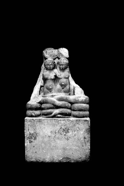 A fare luce arriva ora l'analisi di un reperto rinvenuto in un tempio dedicato ad Hathor, nella città di Dendera in Alto Egitto, e conservato al museo del Cairo. La scultura, alta circa un metro, mostra un bambino e una bambina che si abbracciano, affiancati da due serpenti. "Il capo dei bambini è sormontato da due dischi con inciso l'occhio-udjat, identificabili con sole e luna. Il maschio ha dei riccioli corti e una treccia laterale, tipica dei bambini egiziani, la femmina porta un'acconciatura a grandi ciocche raccolte, molto simile a quella di alcune regine tolemaiche, in particolare di Cleopatra", continua Capriotti. "Lo stile delle figure, in particolare quello delle teste, richiama i modi della cosiddetta scultura greco-egizia. L'opera, che è esemplare nel mostrare l'innovativo dialogo tra cultura egizia ed ellenistica, è stilisticamente affine a un'altra statua rinvenuta a Dendera rappresentante Pakhom, personaggio di alto rango, datata tra il 50 e il 30 a. C".