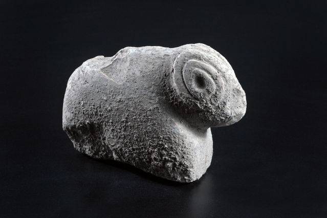 Una scultura a forma di un ariete con le corna ritorte è stato modellato da calcare.