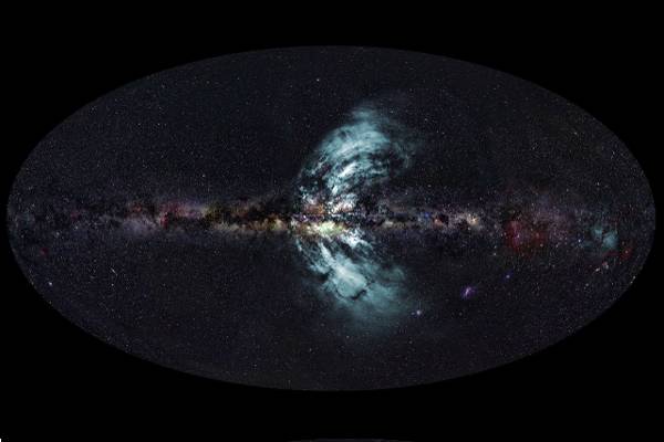 Il colpo d'occhio è sbalorditivo. Due nubi color acquamarina, pressoché simmetriche, si diffondono dal centro della nostra galassia per migliaia di anni luce. Il loro aspetto etereo non deve però trarre in inganno: questi chiari aloni sono in realtà getti estremamente potenti di particelle cariche. Flussi, mai osservati prima, con un'energia pari a un milione di volte quella prodotta da un'esplosione stellare.