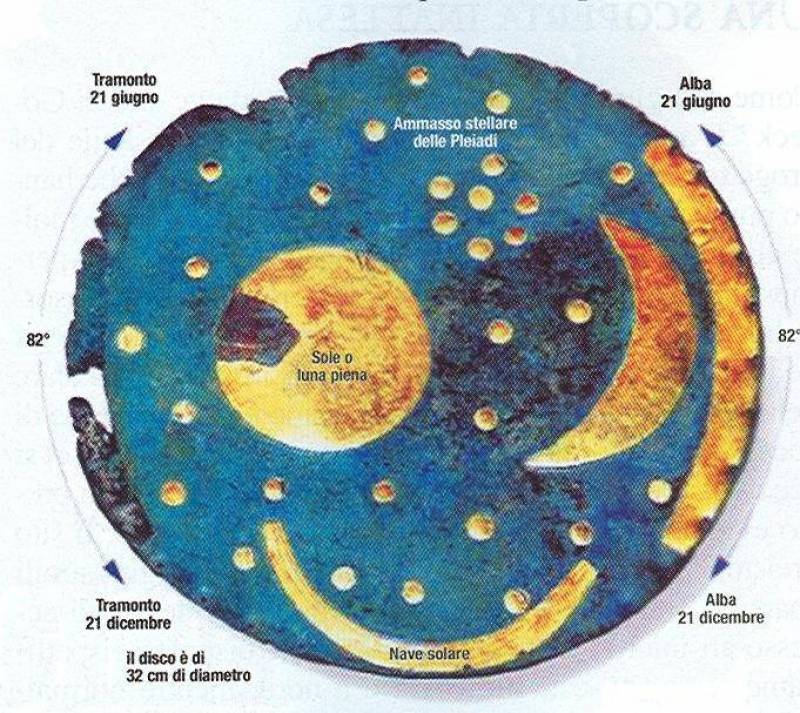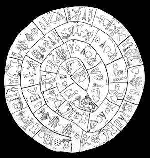 Si tratta del disco di Festos, trovato a Festos (Creta) dall' Italiano Luigi Perneri nel 1908; è una tavoletta circolare di terracotta realizzata nel 1700 a.C., raffigurante geroglifici non ancora interpretati. Reperto archeologico piuttosto ambiguo, bellissimo dal punto di vista estetico, reca sulle due facciate (come possiamo vedere dal disegno: sono presenti entrambe le facce del disco) segni pittografici che rappresentano pietre, uomini, foglie, pesci sconosciuti, oltre che un boomerang, che come sappiamo è un arma di origine oceanica e non greca!