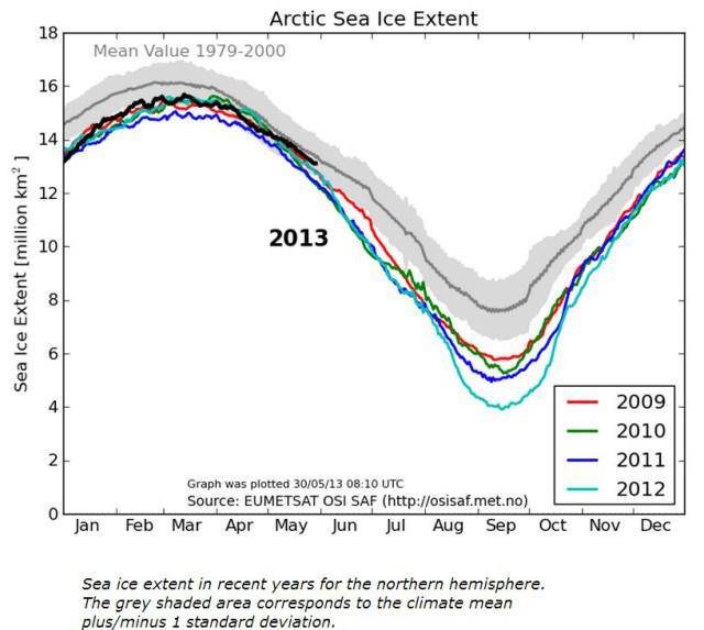 E lo scioglimento dei ghiacci su scala planetaria? A questo punto non è difficile immaginare che è pure questo è un falso. La ricerca che ha "provato" lo scioglimento dei ghiacci è un falso della peggior specie. Delle molte decine di migliaia di ghiacciai del pianeta i ricercatori ne hanno preso in considerazione solo poche decine, questo significa che tale ricerca può essere definita con certezza scienza spazzatura. Venne detto che i ghiacci dell' Himalaya sarebbero scomparsi entro il 2035. La realtà provata in epoca recente, con dati certi e non smentibili dice che i ghiacciai planetari sono in avanzata non in regresso, questo ha portato nel 2009 allo scandalo che è stato definito Himalayagate. E i ghiacci dei poli che sono in forte scioglimento? Non stupisce che pure questo è un falso. I ghiacci dell'Antartide hanno battuto ogni record storico di estensione, quelli dell'artico contrariamente a quanto annunciato dalla BBC sono nella norma e pure loro un po' più del solito, lo potete vedere dal grafico. Ei mari? Misurazioni satellitari precise dicono che vi è il solito lentissimo aumento rimasto inalterato fin dalla fine dell'ultima era glaciale. E' di questi giorni la notizia che dei russi con un bus sono partiti dalla Russia e attraversando l'artico hanno raggiunto il Canada percorrendo 4.000 chilometri alla media di circa 10 chilometri orari. Partenza dall'arcipelago Severnaya Zemlya arrivo a Resolute Bay. Pare proprio che i ghiacci anziché essere in scioglimento sono solidi abbastanza da consentire il transito di un bus. Chissà se la BBC ha dato la notizia?