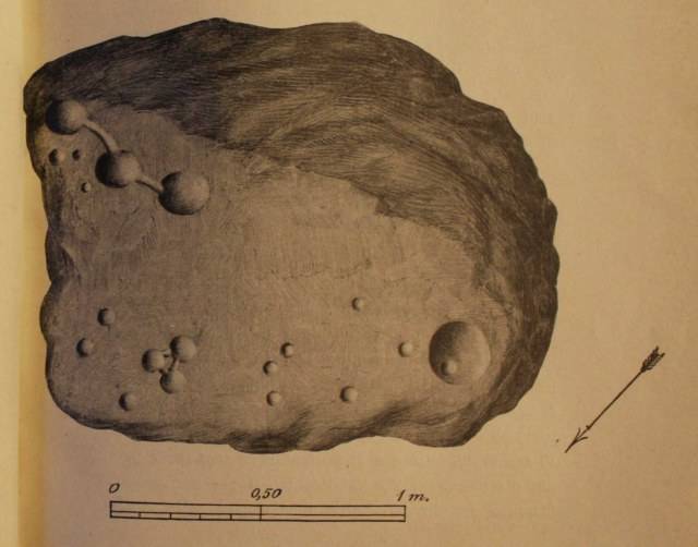 Questo ultimo simbolo è stato rinvenuto anche su altre iscrizioni rupestri e compare anche su una moneta celtica insieme al simbolo delle tre stelle concatenate che è raffigurato con le tre grosse coppelle collegate da canali, chiaramente di natura sacrificale.