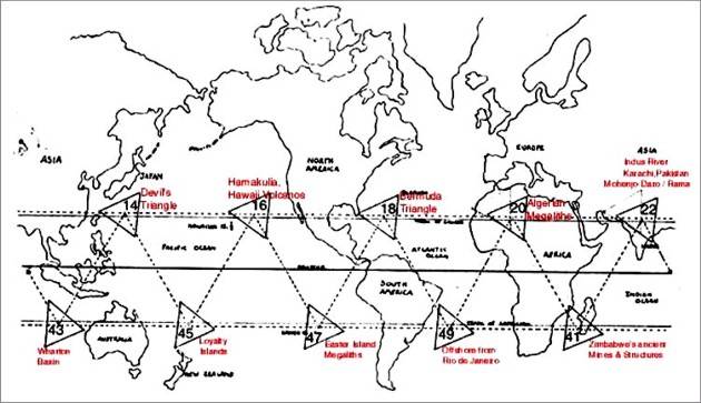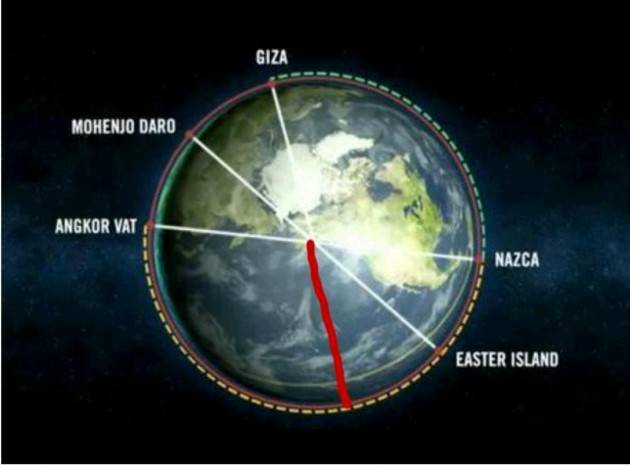 Come si può vedere dall'immagine, a ciascuna delle linee bianche tracciate sul globo terrestre corrisponde un sito archeologico che ospita una piramide o un complesso megalitico. Quando si completa il tridente, si ottiene una linea (quella rossa) che termina proprio sopra le Hawaii.