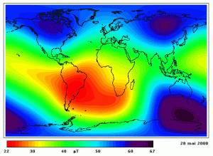 La cartografia globale del campo magnetico terrestre mostra un forte minimo dell'intensità del campo in un'area, della grandezza di diversi milioni di chilometri quadrati, che si estende dall'America meridionale verso est a interessare una vasta regione di Oceano Atlantico meridionale. È la cosiddetta anomalia magnetica del sud Atlantico, una regione di considerevole attenuazione del campo magnetico terrestre rispetto al valore che si ha altrove normalmente a quelle latitudini.
