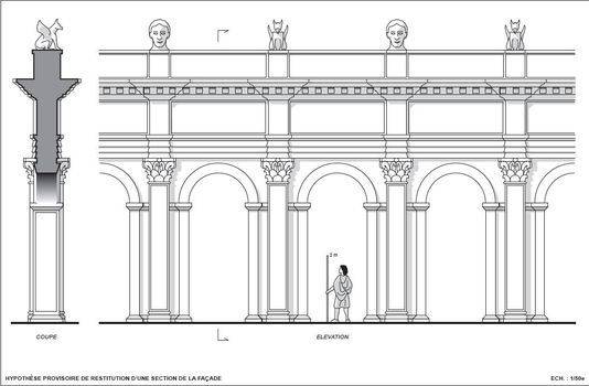 Questo muro, composto da 13 a 17 arcate, crollò poco dopo la sua costruzione. Per quale ragione? Difficile dirlo, ma la natura sabbiosa del suolo avrebbe potuto compromettere l'edificio. "Con una tale altezza, basta un piccolo disordine nelle fondamenta perché tutto si muova", dice Christophe Gaston, architetto archeologo all'Inrap, che ha proceduto a una prima ricostruzione, su carta, dell'edificio. È sorpreso, dice, dalla leggerezza dei suoi antichi predecessori: "Bisognava avere la faccia tosta per costruire una tale facciata senza sostegni".La gioia degli archeologi di ritrovarsi davanti a un edificio unico nel suo genere in questa regione dell'impero romano è offuscata però da uno scherzo del destino: se il crollo fosse avvenuto nell'altro senso, le statue in alto si sarebbero conservate meglio. Gli antichi avranno certamente recuperato una parte dei blocchi di pietra intagliati, come hanno fatto, per costruire un altro edificio di culto all'interno del santuario. Ma le teste monumentali, la cui parte posteriore è oggi visibile, avrebbero conservato i loro visi nella sabbia, protette nei secoli.Qual era la funzione di una tale facciata così decorata? A quale edificio di culto portava? Gli archeologi non hanno ancora le risposte. Delle iscrizioni in bronzo che lo ornavano è rimasta solo la barra di una lettera. Parallela alla via romana che collegava Senlis a Beauvais, il muro si elevava vicino a delle vestigie galliche. Non conosciamo dei grandi agglomerati urbani gallo-romani nelle vicinanze. Ma a Pont-Sainte-Maxence sono stati scoperti dei bacini di scarico antichi che possono indicare l'esistenza di altre costruzioni.