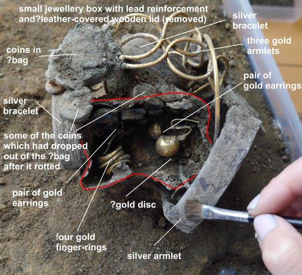 Gli archeologi pensano che fossero stati nascosti dal loro ricco proprietario nel 61 d.C., quando l'esercito di Budicca incendiò la città.In totale gli archeologi hanno recuperato: tre bracciali d'oro, una collana d'argento, due braccialetti d'argento, un bracciale d'argento, un sacchetto con delle monete e un contenitore con quattro anelli e due paia di orecchini d'oro.