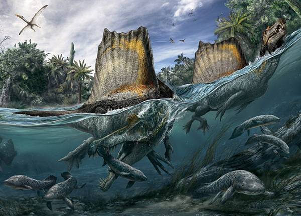 Lo spinosauro, l'unico dinosauro a noi noto che si adattò alla vita in acqua, nuotava nei fiumi dell'Africa del Nord un centinaio di milioni di anni fa. Viveva in un'area perlopiù priva di grandi erbivori terrestri e si cibava soprattutto di pesci enormi.