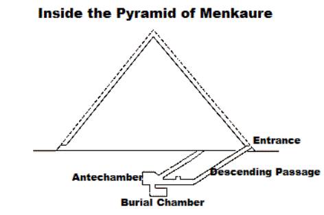 L'interno della piramide è molto complesso. Presenta un ingresso a nord a circa 4 metri d'altezza che conduce in un tunnel rivestito di granito rosa di circa 32 metri e con un'inclinazione di 26° ed un successivo grande corridoio di circa 13 metri di lunghezza, 4 metri di larghezza e 4 metri di altezza.