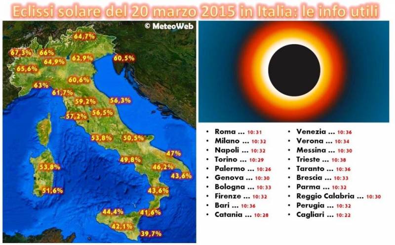 eclissi solareLa percentuale massima di oscuramento del disco solare da parte della luna, tra le città italiane, sarà quella di Aosta (67, 3%). A Torino l'oscuramento sarà del 65, 6%, a Milano del 64, 9%, a Genova del 63%, a Bologna del 60, 6%, a Trieste del 60, 5%. La percentuale diminuisce scendendo verso Sud: 59, 2% a Firenze, 56, 5% a Perugia, 53, 8% a Roma, 49, 8% a Napoli, 47% a Bari, 44, 4% a Palermo, 43, 6% a Lecce e Cosenza, 41, 6% a Messina e Reggio Calabria, 39, 7% a Siracusa. In Sardegna, invece, 51, 6% a Cagliari e 53, 8% a Nuoro.