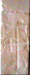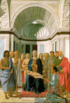 La pala è dono del duca Federico da Montefeltro ad una chiesa dell´Osservanza d´Urbino. E´ destinata a celebrare tanto il gran predicatore francescano in odore d´eresia San Bernardino da Siena, [2] sia come espressione di gratitudine all´Eterno. La moglie del duca Federico, Battista Sforza, infatti, riceve la grazia di dare alla luce un erede maschio per il nobile casato. Quanto si vuole evidenziare, è l´allegoria della "generazione increata", ben evidente nel dipinto di Piero della Francesca. La conchiglia sullo sfondo è monumentale. Si è adottata quale straordinaria, improbabile, decorazione del catino absidale. Coraggiosamente. Si rivela essere il risultato d´un sottile esercizio mentale. Un´eccellente speculazione intellettuale. La metonimia si elabora mediante una ratio semplice. E´ in grado, nondimeno, di rendere materiale un mistero profondo. Delicato. Insondabile altrimenti. E´ una verità di fede. E´ la straordinaria maternità di Maria. Passiamo ora ad un altro indizio strettamente correlato al precedente. E´ una complessa iscrizione. Il logo identifica l´abbazia cisterciense di Santa Maria di Morimondo. Si devono notare, nel caso in discorso, le anse terminali relative al braccio orizzontale della tau. Riprendono in duplicato i risvolti della conchiglia pecten in genere, e dunque anche di quella riprodotta nella "Pala Montefeltro". Su questo, non esistono grandi dubbi. L´argomento si vedrà ancora più oltre ...