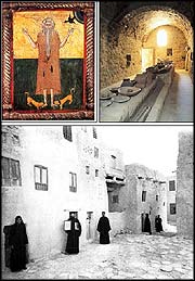 Con l´aiuto di una puleggia, i primi pellegrini venivano spinti dentro una finestra che serviva come porta; in seguito accedevano da livello terra ad una porta, alla quale dovevano suonare una campana per avvisare i monaci del loro arrivo. Nel corso degli anni alcuni degli edifici del monastero caddero in rovina e furono abbandonati, mentre altri furono restaurati, le loro pareti ridipinte con immagini di santi e di uomini sacri. Per tutto il medioevo, dal XII al XIX secolo, patriarchi, preti, e uomini pii, viaggiatori e storici, si recarono in pellegrinaggio, spostandosi fin dalla Francia e dall´Inghilterra ad Ovest e dalla Russia ad est; talvolta singolarmente, spesso in gruppi. Talvolta trovavano il monastero in cattivo stato, scarsamente popolato di monaci. Altre volte invece, era fervente di vita e grande impegno era profuso per mantenere il complesso in buone condizioni.