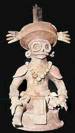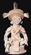 Gli artisti di Copán ritrassero Yax K´uk Mo con ornamenti tipici di Teothiuacán. La foto a destra mostra il re con una sorta di occhiali che formano parte di un caratteristico elmetto di guerra di Teothiuacán. E nella sua tomba, che fu scoperta nel 1995, gli archeologi hanno trovato ceramiche provenienti da Teothiuacán.