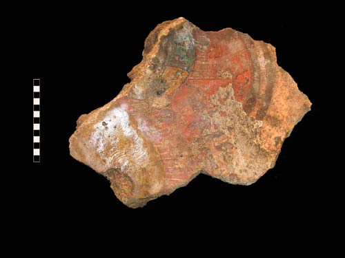 Di notevole importanza i materiali recuperati nell´ambiente sotterraneo, in particolare alcune porzioni della volta crollata in cui sono visibili una mano femminile, il volto di un personaggio, posto di fronte, con un nimbo, al di sotto del quale si scorge parte di un sole radiato, il tutto su un fondo blu. Nell´iconografia si legge una chiara impronta medievale, che ci riporta alla pittura giottesca del 1300. La buona fattura degli affreschi li fa collocare nell´ambito di una committenza importante e di botteghe specializzate, quasi sicuramente dell´area romana.