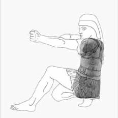 La statua, che è stata danneggiata quando fungeva da stipite, reca anche altre particolarità. Da quel che rimane di essa, in sostanza la parte del torso, gli studiosi hanno potuto determinare che raffigurasse un guerriero inginocchiato nell´atto di scagliare una freccia o una lancia. La maggior parte delle altre statue del periodo ritrae guerrieri seduti o con le gambe incrociate.
