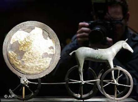 In questi giorni il disco di bronzo - che misura circa 32 cm di diametro e pesa circa 2 chili - con foglie d´oro applicate a rappresentare il sole, la luna, alcune stelle ed una nave, è stato l´attrazione principale all´apertura della mostra, che vanta molti reperti preziosi. E´ questa la prima volta in cui sarà visibile al pubblico dopo il restauro.