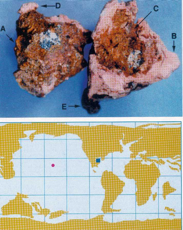 E' di pochi mesi fa l'annuncio che in campioni del sottile strato geologico sedimentario che segna il passaggio tra il periodo Cretacico e Terziario (coincidente con lo strato di Gubbio), prelevati sul fondo dell'Oceano Pacifico centro-settentrionale, è stato ritrovato un minuscolo meteorite fossile, delle dimensioni di 2, 5 millimetri, che con ogni probabilità proviene dall'oggetto che provocò il cratere di Chicxulub (Nature, 396, 237). I campioni prelevati consistono di un argilla pelagica di colore molto scuro, tipica dei sedimenti dell'Oceano Pacifico settentrionale. La componente silicacea di questi sedimenti è formata da particelle delle dimensioni di pochi micrometri portate dai venti e provenienti dal continente asiatico e nord-americano: 65 milioni di anni fa il sito in cui sono stati prelevati campioni era localizzato nella parte centrale del paleo-bacino del Pacifico settentrionale, a migliaia di chilometri dal più vicino continente e circa 9000 km ad occidente del cratere di Chicxulub.