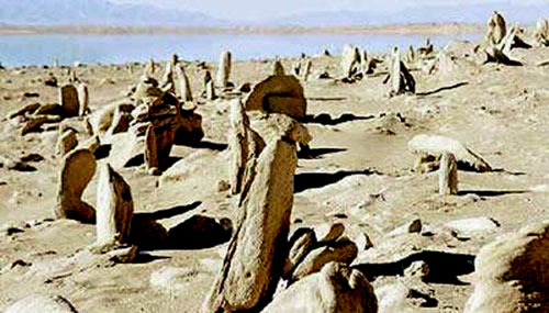 Sulla sponda sud del lago salato, il Toson, si trovano i relitti che la gente indica come lasciati da extraterrestri. Appaiono come una piramide alta 50/60 metri; una grande struttura di tubi di metallo con diametri che variano da dieci a quaranta centimetri. Di fronte ad essa si osservano tre caverne con aperture triangolari, due collassate e inaccessibili; una terza, più grande delle altre, con il pavimento a due metri sotto il livello del suolo e la volta a otto metri sopra, con una profondità di sei metri. Al suo interno, posato sul terreno, vi è un tubo lungo 40 centimetri, tagliato a metà, mentre un altro è interrato e se ne vede solo un´estremità che sbuca dal terreno. All´esterno della caverna, lungo la riva del lago, sono sparsi numerosi frammenti rugginosi, tubi di vari diametri fra due e 4, 5 centimetri, pietre stranamente modellate. Alcuni tubi spariscono sotto la superficie del lago. Sono tutti di un color rosso tendente al marrone come le rocce circostanti e, nonostante siano sottili, non presentano ostruzioni dopo essere stati sottoposti per anni ai movimenti sabbiosi.