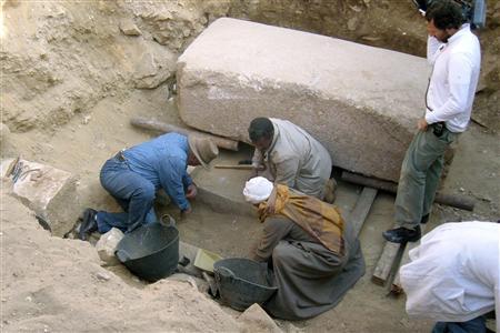 Il Dipartimento governativo alle Antichità ha rivelato che, dopo cinque ore impiegate per sollevare il coperchio di un sarcofago in una piramide, scoperta l'anno scorso a sud del Cairo, hanno trovato un cranio, le gambe, il bacino, il resto del corpo avvolto in fasce di lino e terraglie ceramiche.