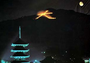L´accensione dei fuochi segna l´inizio della celebrazione, durante la quale le famiglie visitano le tombe dei propri defunti e li invitiamo a ritornare a casa. Le montagne circostanti Kyoto s´illuminano di lanterne, che formano il disegno che si vede nella foto. Fuochi chiamati okuribi sono accesi anche presso le residenze delle famiglie, nello sforzo di indirizzare verso casa gli spiriti degli antenati. Alla fine dei tre giorni di Obon, di solito il 15 del mese, le famiglie portano le lanterne di carta di candela con lo Spirito dei loro morti a galleggiare liberamente nei fiumi e nei torrenti, in modo da disperdere i loro Toro-nagoshi con gli antenati e farli ritornare in cielo, sino al prossimo anno.