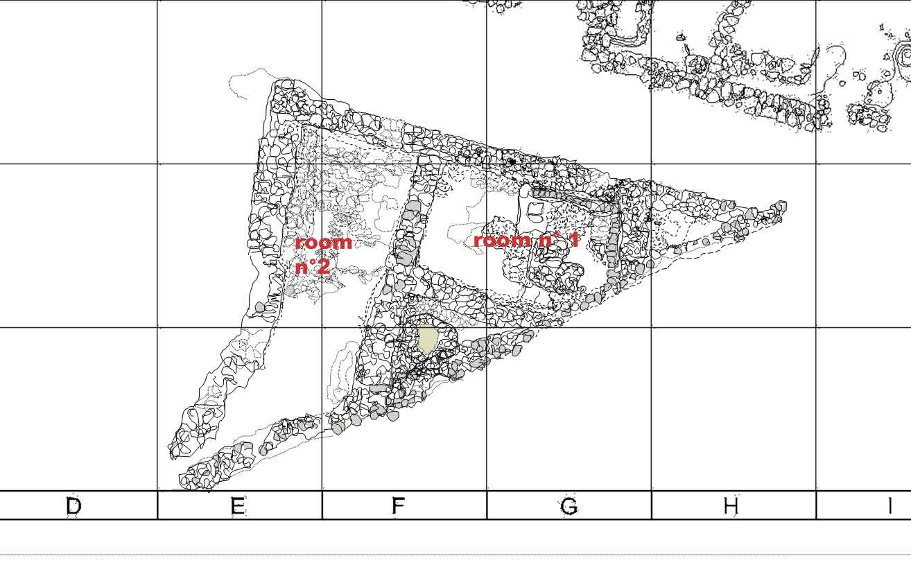 La sala n°2 è stata divisa dalla n°1 nella fase finale di riorganizzazione del complesso, con una parete di divisione che copre un riempimento di terra. La stanza è rettangolare, affusolata verso sud-est per seguire la figura triangolare del complesso. È divisa in due parti: quella a nord era coperta, quella a sud scoperta. La parte nord mantiene intatte le rovine del crollo delle strutture ai tempi del terremoto. Il crollo, che non è stato rimosso, ci dà informazioni importanti sull'assetto originale. Ad esempio il fatto che la faccia ovest del muro fosse stata rinforzata, precisamente nel punto in cui ci era una piccola finestra rettangolare. Il crollo della parete ad ovest, con le pietre ancora connesse, mostra chiaramente la sua esistenza. (fig.4)