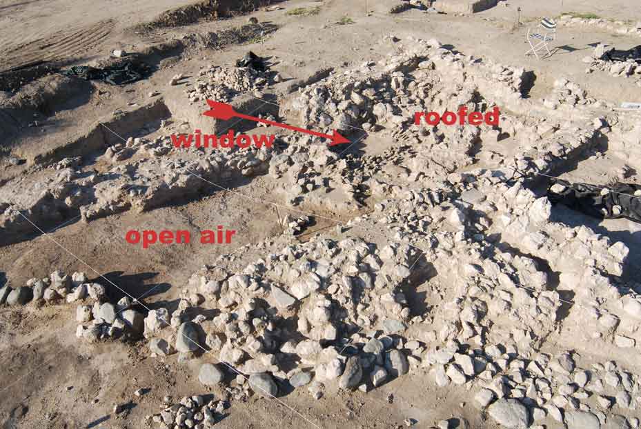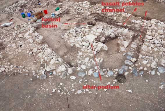 La costruzione sembra destinata al culto, vista la presenza di un altare, fiancheggiato da una scanalatura da due lati. La scanalatura è fatta di ciottoli pesanti di basalto ed è intonacata ai lati, è servita probabilmente per l'eliminazione del sangue delle vittime e dell'acqua lustrale. L'ultimo era preso da un pozzo quadrato individuato sul lato nord dell'altare. La destinazione religiosa è confermata dai materiali abbondanti trovati (non solo ceramica), compresi 4 corni di calcarenite di formati differenti, un certo numero di ossa d'animali sacrificati (pricipalmente frammenti di teste di toro e d'ariete e decine di conchiglie. La particolare forma triangolare della costruzione (temenos) sembra attribuibile all'ultimo episodio di ricostruzione del tempio, tenendo conto della cronologia della ceramica che va dalla prima età del bronzo (2500-2350 a.C.) all'età del bronzo centrale II (1850-1800 a.C.). (Fig.2)