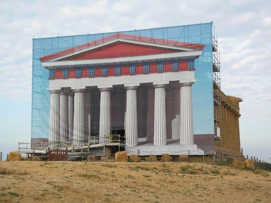 Colori che sembrano un cartone animato, una trasposizione provocatoria che si sovrappone all´unico film finora conosciuto, ma che più antichi di così non si può. Guardiamo il tempio della Concordia. Agli agrigentini nel V secolo avanti Cristo, il monumento appariva rosso, bianco e blu. E oggi l´ente Parco, dopo le ricerche condotte in collaborazione con il dipartimento di Storia dell´Architettura dell´Università di Firenze, ha realizzato nel cantiere di restauro un ponteggio in scala 1 a 1, che raffigura l´immagine del tempio come doveva essere. Il pannello con il tempio a colori sta appoggiato al tempio vero in pietra calcarea. E colpisce come un flash lo sguardo stranito di chi ammira.