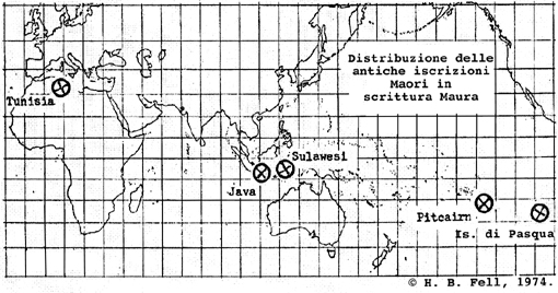Le decifrazioni compiute da Barry Fell nei primi anni ´70 rivelano che le antiche iscrizioni maori formano una cintura da est verso ovest, lunga quasi 30.000 km, dal Nord della Tunisia ad ovest sino alle isole di Pitcairn e di Pasqua ad est, nel Pacifico centrale. Le iscrizioni più antiche sono databili ai sec. III e II a.C., e si trovano in entrambe le estremità di questa cintura. Le origini della forma di scrittura e del linguaggio utilizzati sono nord-africani. Il Nord della Tunisia, con un migliaio o più di tali iscrizioni, deve quindi essere identificato come la madrepatria dei polinesiani.