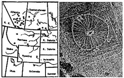 [foto3] A sinistra – La distribuzione delle Ruote di Medicina nel Nord America (Zwarum, 1977). A destra – Foto aerea della Ruota di Medicina di Bighorn, Wyoming (Zwarum, 1977).