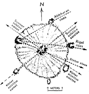 [foto6] Pianta del cerchio–calendario compreso nella Ruota di Medicina di Bighorn, Wyoming, secondo John Eddy (1977), con integrazioni.