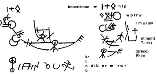 Mancano le vocali e la trascrizione delle consonanti corrisponde qui quasi esattamente alla forma standard del Medio Egiziano. Poiché vi sono anche lettere latine inserite al posto dei segni maori, il testo può essere direttamente tradotto dall´egiziano, secondo la forma data da Faulkner (1972).
