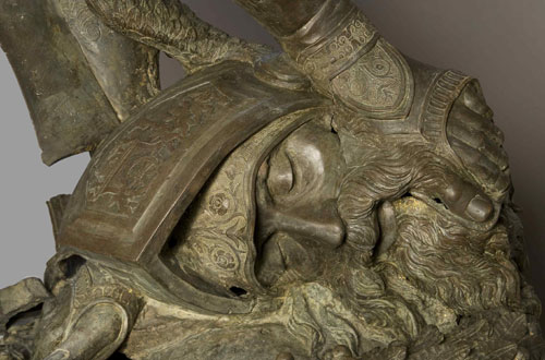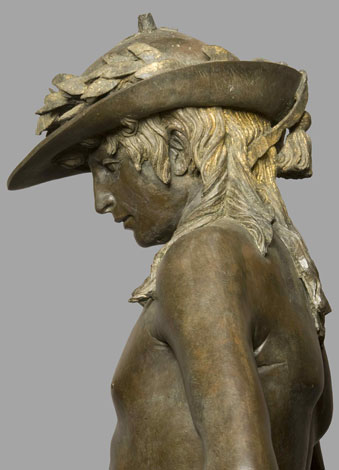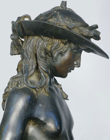 Ma è la collocazione originaria che dà un senso all´opera, essa infatti vuole essere simbolo della stessa città di Firenze. Se osserviamo da vicino il bronzo capiamo che è stato concepito per stare al centro di uno spazio aperto, un cortile, dove i punti di vista sono molteplici, e lo prova la scansione delle forme, un braccio sul fianco, il sinistro, un altro che regge mollemente la lunga spada, il movimento delle gambe, una diritta, una piegata e in atto di muovere. Dunque questo Davide è molto diverso da quello di trenta anni prima proprio perché Donatello, che adesso ha a lungo meditata la scultura romana, intende collegare qui due iconografie: il singolare copricapo ornato di trionfale alloro che chiude in alto la figura si lega direttamente all´immagine di Mercurio, il messaggero degli dei. In basso il capo di Golia, catafratto nel suo elmo la cui rinascimentale celata è alzata, propone dense decorazioni a cesello con tralci all´antica. Davide è nudo, dunque, come è nuda la veritas, ed è nudo anche perché l´artefice segue il testo della Bibbia secondo la quale il giovane si spoglia della armatura per meglio affrontare l´impari combattimento.