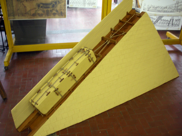 Secondo la ricostruzione del professore Giorgio Faraggiana e Osvaldo Falesiedi, dipendente di Iveco con la passione per l´a rcheologia, venivano inserite tra le funi sbarre laterali per esercitare una maggiore leva. «Le nicchie che si notano alla base delle pareti della galleria, considerata a lungo come un corridoio cerimoniale - spiega Faraggiana - non servivano affatto a ospitare statue commemorative, ma a bloccare le traverse di legno, mentre la galleria forniva la parte rigida della macchina».