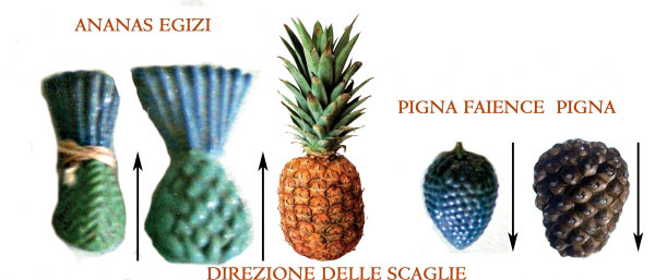 Durante il mio ultimo viaggio in Egitto ho scoperto alcuni particolari sfuggiti ai miei colleghi italiani e stranieri in grado di sovvertire la storia della navigazione. Secondo la versione ufficiale della storia, prima dell´arrivo di Colombo in America, nessuno era a conoscenza dell´esistenza del continente americano e le civiltà che si svilupparono prima del 1492 vissero in un "beato" isolazionismo ignare di grandi culture che sorgevano e collassavano sul suolo del continente oltreoceano. Esiste una versione alternativa però, definita Diffusionismo, che sostiene che le civiltà del Vecchio Mondo, gia in antico sapevano dell´America, e con le sue civiltà commerciavano beni e scambiavano conoscenza. Esistono una serie di indizi archeologici e storici interessanti a sostegno che l´America fosse conosciuta prima di Colombo ma oggi possiamo avanzare l´ipotesi che già gli antichi egizi ebbero rapporti commerciali con l´America (forse vi giunsero con le loro navi, oppure ricevettero merci portate da altri popoli che avevano rapporti con i pre-colombiani). Tali indizi sono molto consistenti e li ho personalmente individuati tra reperti ufficiali conservati al Museo del Cairo. Nella sezione del museo destinata al periodo amarniano e al faraone Akhenaton vi è una teca con piccoli oggetti in faience trovati nelle tombe amarniane (1352-1295 a.C.). Alcuni sono certamente delle pigne ma due piccoli oggetti di colore verde, lunghi solo un paio di centimentri, riportano un lungo ciuffo di colore scuro. È chiaro e lampante che si tratti di ANANAS, in quanto le pigne non presentano tale ciuffo essendo un frutto di alberi di conifere e non un frutto di una pianta grassa che è originaria del Sud-America e portata in Europa ufficialmente solo dopo Cristoforo Colombo. Inoltre si osservi la direzione delle "scaglie". In una pigna queste puntano verso il basso e ciò è ben riprodotto anche nelle pigne di faience egizie poste nella bacheca. Nell'ananas le scaglie puntano naturalmente verso l´alto e questo è quanto si vede dai due piccoli ananas di faience egiziani (ve ne è forse un terzo, più grande, anch'esso di colore verde ma sembra aver perso il ciuffo). Il colore verde è naturale per gli anans colti acerbi. Dunque, cosa ci fanno degli ananas in Egitto se le culture d´Egitto e del Sud-America mai vennero ufficialmente a contatto?