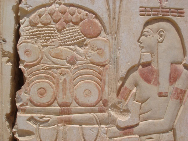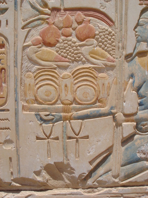 Un altro indizio è dato da alcune pannocchie di mais che, personalmente, credo di aver individuato tra i rilievi del tempio di Ramses II ad Abydo. Sulla parete interna destra del muro di cinta il dio del Nilo Api porta delle offerte. Due rilievi, uno successivo all´altro mi permettono di discutere la presenza di questa pianta americana da coltivazione tra gli egizi. Infatti in un rilievo Api porta dei pani, fichi, melograni, anatre e uva. Non c´è alcun dubbio che si tratti di uva. In quello successivo le offerte sono le stesse ma stavolta l´uva è stata sostituita da qualcosa di più allungato che di certo non è uva, né si tratta di pigne. Credo, anche se sono meno sicuro rispetto agli ananas del Museo del Cairo, che si tratti di mais. Sembra di ravvisarvi anche una delle classiche foglie allungate che ricoprono la spiga in quella a sinistra dell´immagine. L´uva, inoltre, come si evince dallo stesso bassorilievo posto di fianco sullo stesso muro, ha ben altro aspetto, molto più riconoscibile.