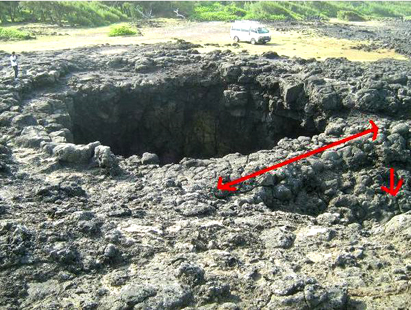 A 70 m da lì, a nord–est della rampa del serpente, si trova il Ponte Naturale, una doppia arcata che appoggia su un gran pilastro centrale, fatto di pietra vulcanica, sull´Oceano, un tempo proprio di fronte al levar del sole. L´Oceano scaglia ondate contro la falesia e lancia in aria spruzzi ad oltre 30m. La risacca comprime l´aria nella cavità e la fa uscire attraverso due crepe nella volta, sulla piattaforma, con un suono potente. Almeno uno di questi buchi sembra lavorato, perfettamente rettangolare. Sembra un luogo di culto, nel quale le condizioni naturali siano state adattate per ottenere grandi effetti scenografici. I geologi potrebbero esaminare il luogo e dire se l´opera è naturale o modellata da mani umane. Quelli che conosco hanno già ipotizzato, dalle foto, un intervento di modellazione artificiale. Un gran buco nella volta permette la visione dell´arcata. Potrebbero anche esserci dei gradini ed altri particolari modellati dalla mano dell´uomo.