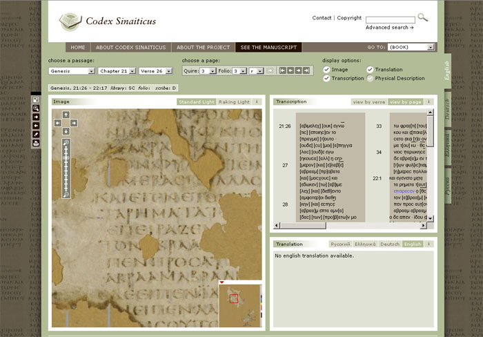 MILANO – Oltre 800 pagine del Codice Sinaitico (Codex Sinaiticus), la più antica copia della Bibbia scritto in greco antico e oggi ancora esistente (insieme con il Codex Vaticano), sono disponibili da consultare online su codexsinaiticus.org: il merito è dello sforzo congiunto di un gruppo di lavoro inglese, russo, tedesco ed egiziano. Le 800 pagine della Sacra Scrittura sono in alta risoluzione ed è possibile navigarle per libri (antico o nuovo testamento, e così via), capitoli e versi. Ogni verso poi ha uno zoom che permette di vederlo nei minimi dettagli, in alcuni casi anche variando la luminosità della pagina per meglio coglierne i particolari. Anche se in queste prime ore, proprio per via del boom di collegamenti, il sito ha qualche difficoltà di accesso.