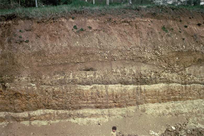 Questi strati sono formati da dei livelli alluvionali e sono fluvio-lacustri, formati da sabbia e da ghiaie e sono stati ammassati in quel posto, perché proprio lì scorreva un tempo un fiume di una certa portata. Anche questo fiume, sedimentando questi strati, ha permesso anche all´uomo preistorico di allora di vivere, perché lasciava uno spazio abbastanza ampio vicino alle sue rive dove l´uomo ha costruito o costruiva stagionalmente l´accampamento di caccia.