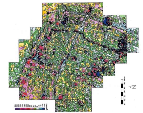 L'area investigata di circa 6 ettari, rappresenta una piccola parte dei circa 120 ettari su cui pare si estendesse la città in età romana, ma i risultati conseguiti permettono di ricostruire una parte significativa del tessuto urbano. Nella mappa a curve di livello del campo magnetivo riprodotta nella foto è ben identificabile la struttura urbana: il reticolo delle strade e il perimetro di grandi costruzioni organizzate in isolati delimitati da strade e canali sono perfettamente riconoscibili. Particolarmente evidente è il canale ubicato al centro dell'area, in direzione sud-est a nord-ovest.